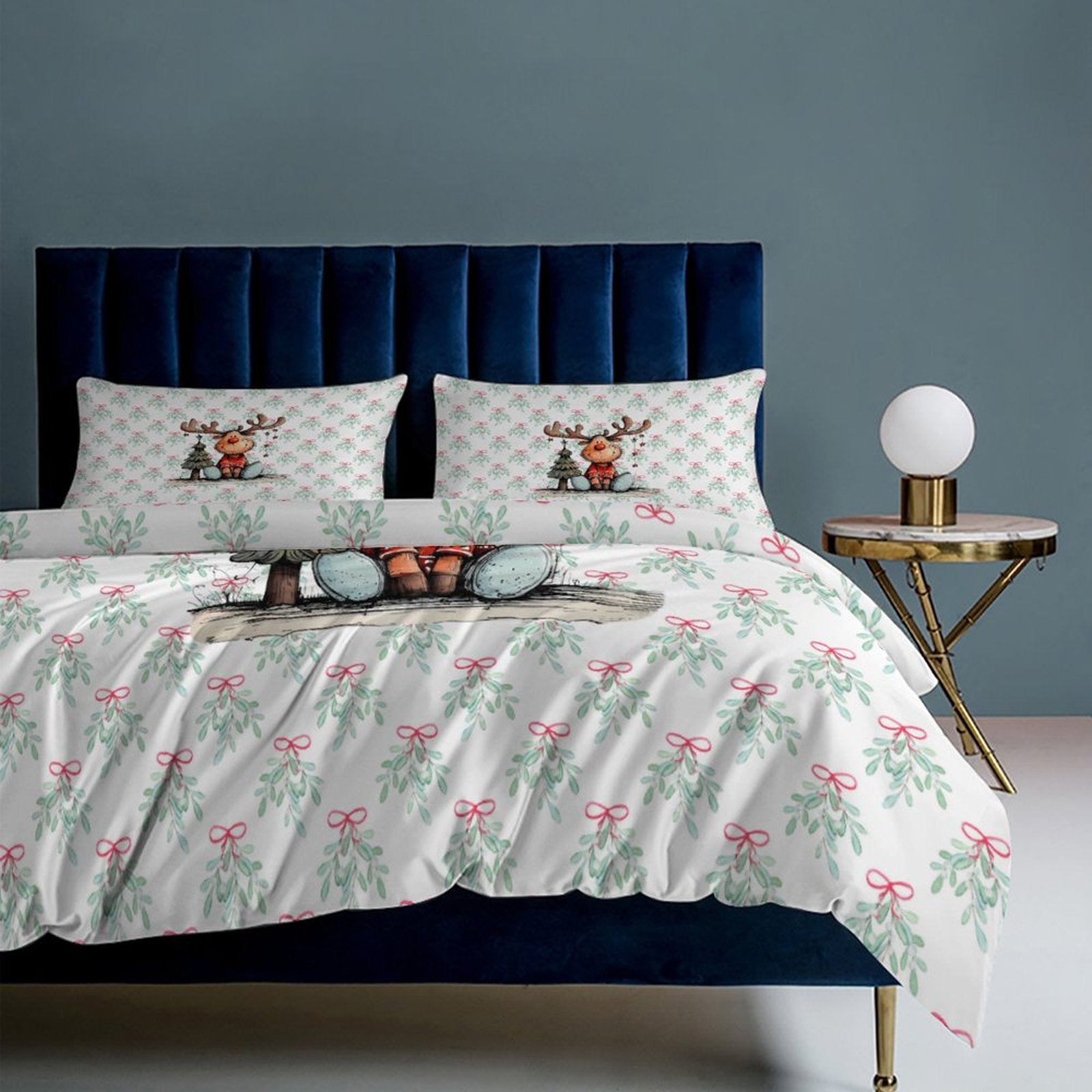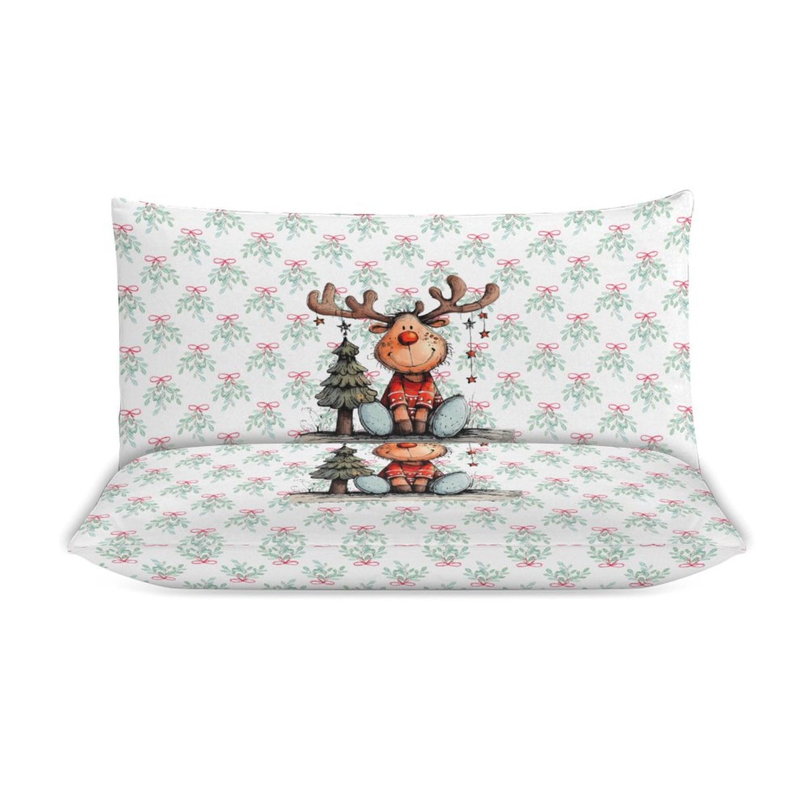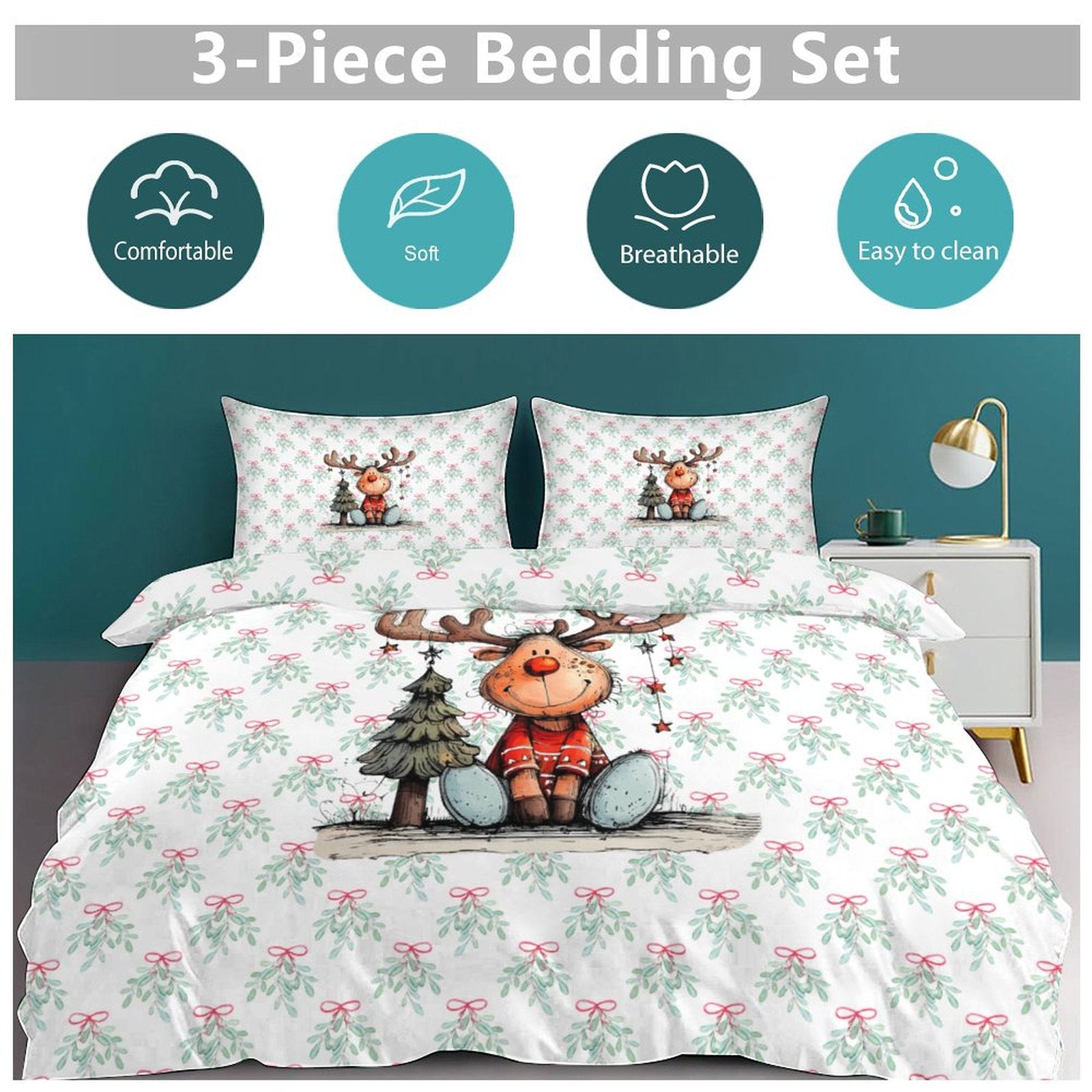 Get ready to wake up in style with the Reindeer Christmas 3pc Set! This unique set features a 100% polyester duvet cover and two pillowcases with vibrant all-over printing. The duvet cover measures 79" x 90", while the pillowcases are 20" x 30". Adding to its playful appeal, the duvet cover has a zipper closure and the pillowcases have adorable envelope seals. The set also includes four corner ties to keep your quilt in place. So go ahead, snuggle up in this super soft and silky set and embrace your fun-loving side! (Insert not included.)