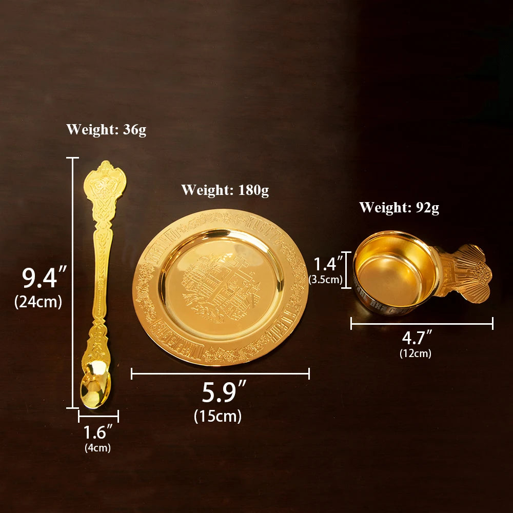 Celebrate sacred traditions with this thoughtfully crafted three-pieces to choose from for this elegant Eastern Orthodox holy oil ritual supplies group. Each piece features elegant gold-plated metal construction, designed to honor the beauty and reverence of your spiritual practice. Perfect for mass supplies and religious ceremonies, this set brings together essential ritual utensils and Corpus Christi plates in one meaningful collection. Embrace the devotion and grace these pieces bring to your faith journey.